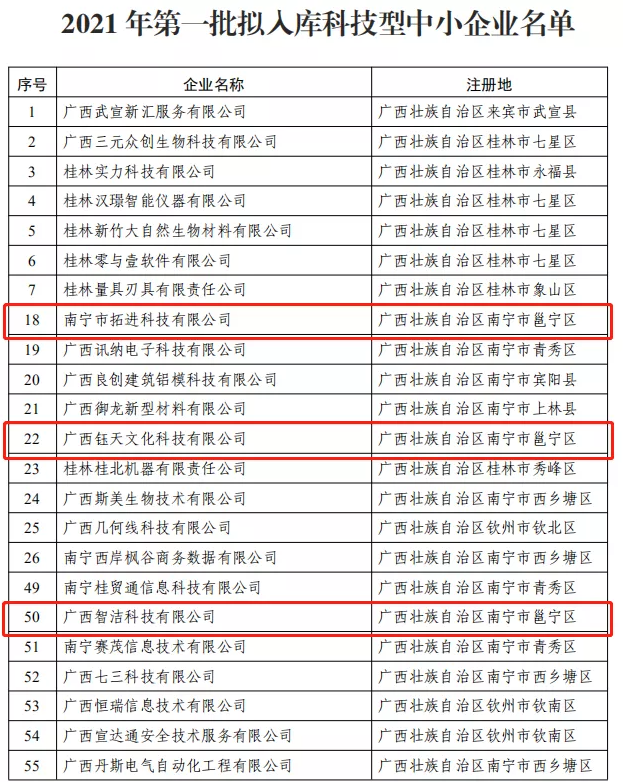 根據(jù)《科技型中小企業(yè)評價辦法》有關規(guī)定,經(jīng)企業(yè)自主評價、各設區(qū)市評價工作機構審核等程序,廣西2021年第一批148家擬入庫科技型中小企業(yè)名單出爐。其中,啟迪之星(南寧)一帶一路孵化基地共有3家企業(yè)入選。分別是南寧市拓進科技有限公司、廣西鈺天文化科技有限公司、廣西智潔科技有限公司。