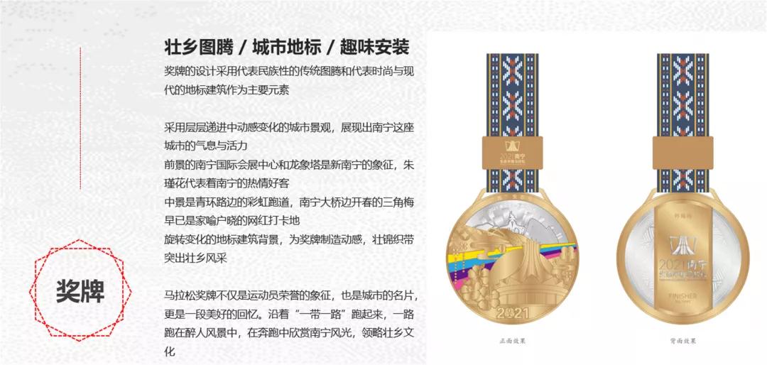 完賽獎(jiǎng)牌方面,精雕細(xì)琢,榮耀禮贊。獎(jiǎng)牌由廣西工藝美術(shù)研究院匠心雕琢,正面以南寧市的地標(biāo)性建筑南寧國際會(huì)展中心為視覺中心,南寧市市花“朱槿花”為背景,輔之以流動(dòng)的線條,將南寧的人文氣質(zhì)、地標(biāo)建筑、城市特點(diǎn)三個(gè)維度無縫融合,展現(xiàn)了首府南寧的城市風(fēng)情和崛起氣勢(shì)。獎(jiǎng)牌使用圓形,簡(jiǎn)潔圓融象征圓滿成功,鏤空鑲嵌轉(zhuǎn)動(dòng)設(shè)計(jì)再添動(dòng)感活力,每一次轉(zhuǎn)動(dòng)都是與壯鄉(xiāng)首府的對(duì)話。