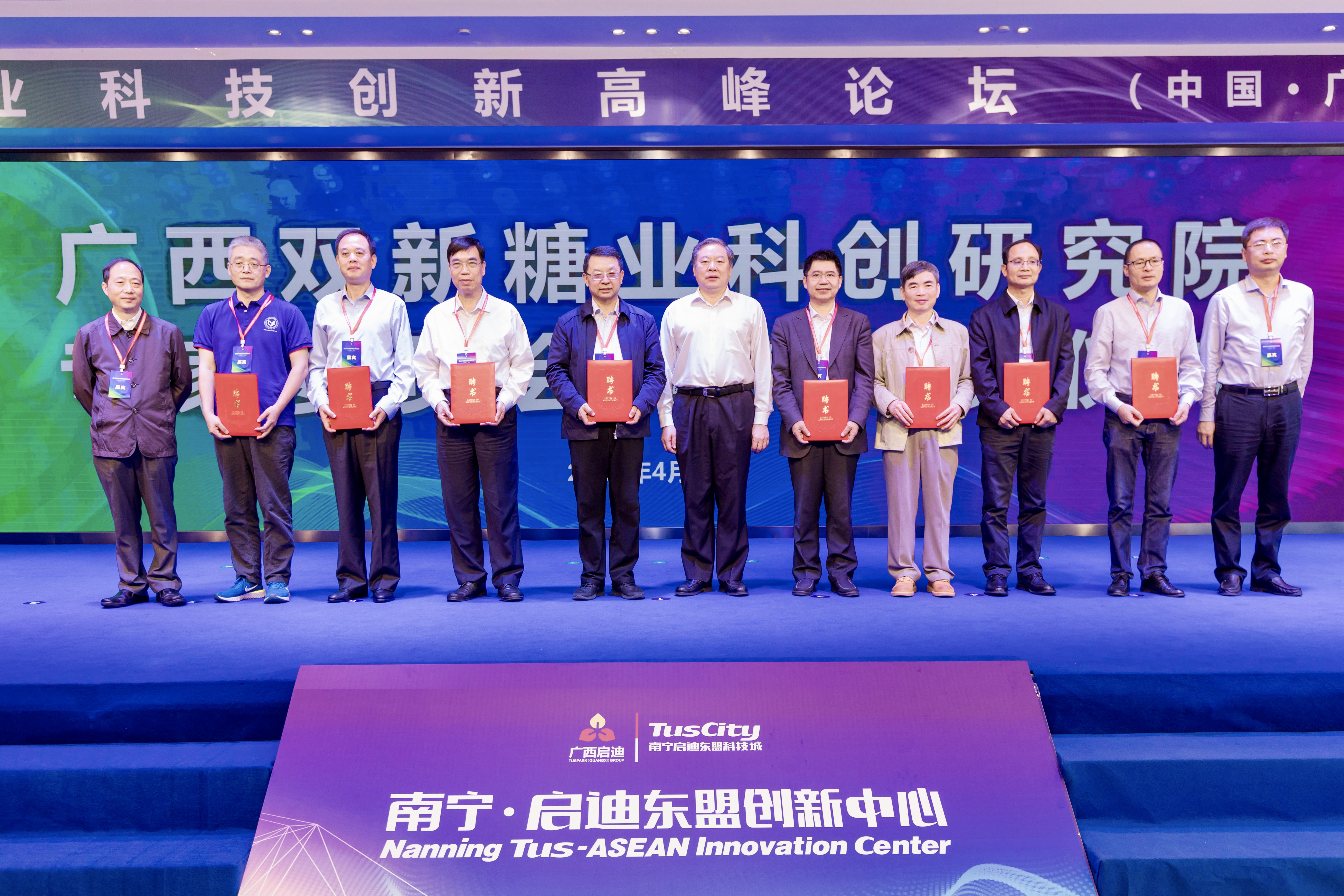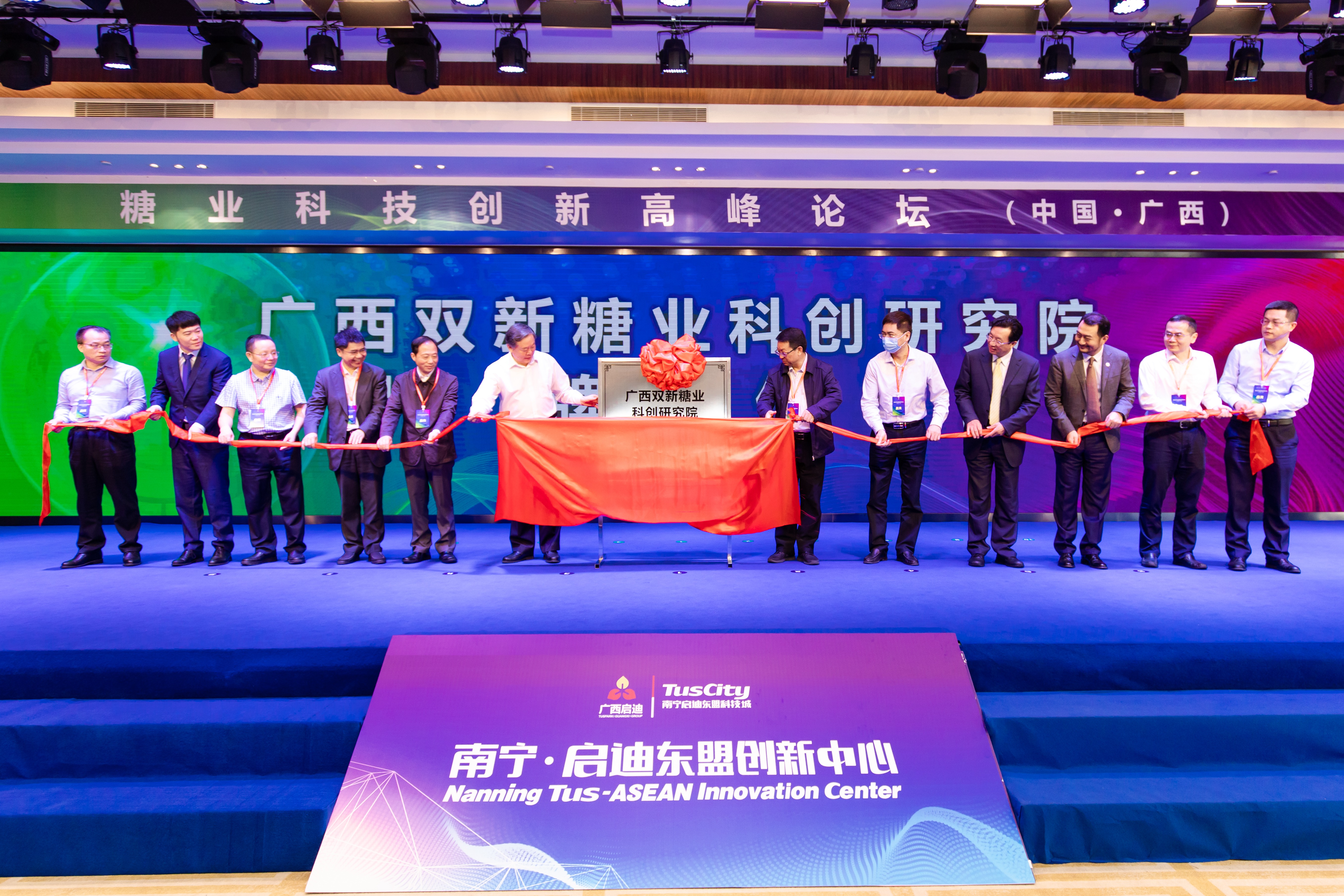 中國工程院院士張福鎖,廣西人大常委會副主任、黨組副書記張秀隆,農委主任委員吳玉斌,廣西糖業(yè)發(fā)展辦公室黨組書記、主任李文綱,廣西科技廳黨組成員姚作芳,清華大學教授劉德華,啟迪控股高級常務副總裁陳鴻波,廣西糖業(yè)集團黨委書記、董事長李慈軍,啟迪控股高級副總裁、廣西啟迪科技城集團董事長李東明,南寧糖業(yè)股份有限公司黨委副書記、總經理肖凌,廣西沿邊跨境金融服務中心有限公司總裁張燚,廣西洋浦南華糖業(yè)集團副總裁凌一津和廣西南寧東亞糖業(yè)集團公共關系總經理馬軍共同為“廣西雙新糖業(yè)科創(chuàng)研究院”揭牌。