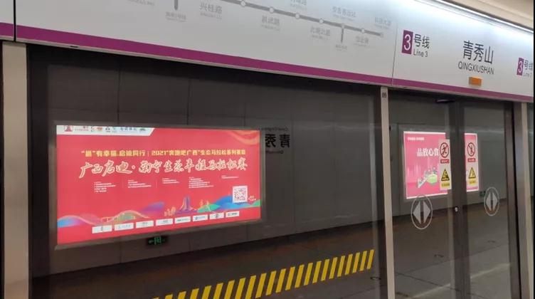 賽事組委會(huì)在1號(hào)線、3號(hào)線、4號(hào)線重要地鐵站點(diǎn)為賽事活動(dòng)投放燈箱廣告宣傳,營造賽事氛圍。