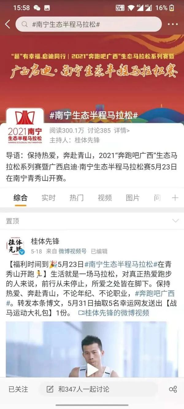 微博話題#南寧生態(tài)半程馬拉松#討論385條,為活動(dòng)持續(xù)造勢,引發(fā)話題熱度,閱讀量逾300.1萬次。