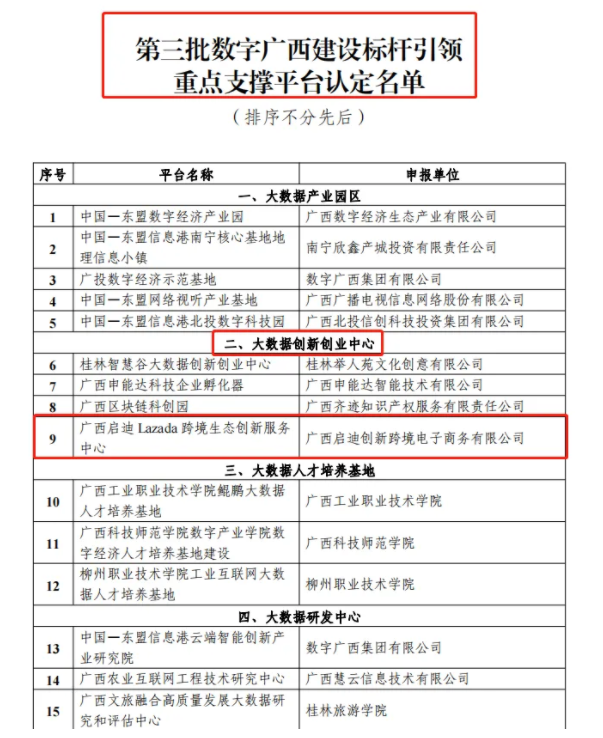 廣西啟迪Lazada跨境生態(tài)創(chuàng)新服務(wù)中心獲評第三批數(shù)字廣西建設(shè)標(biāo)桿引領(lǐng)重點(diǎn)支撐平臺
