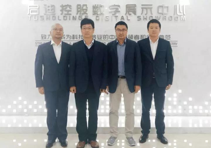 ▲ 房漢廷副社長(左二)、劉峰總編輯(右二)座談會后參觀考察啟迪控股數(shù)字展廳