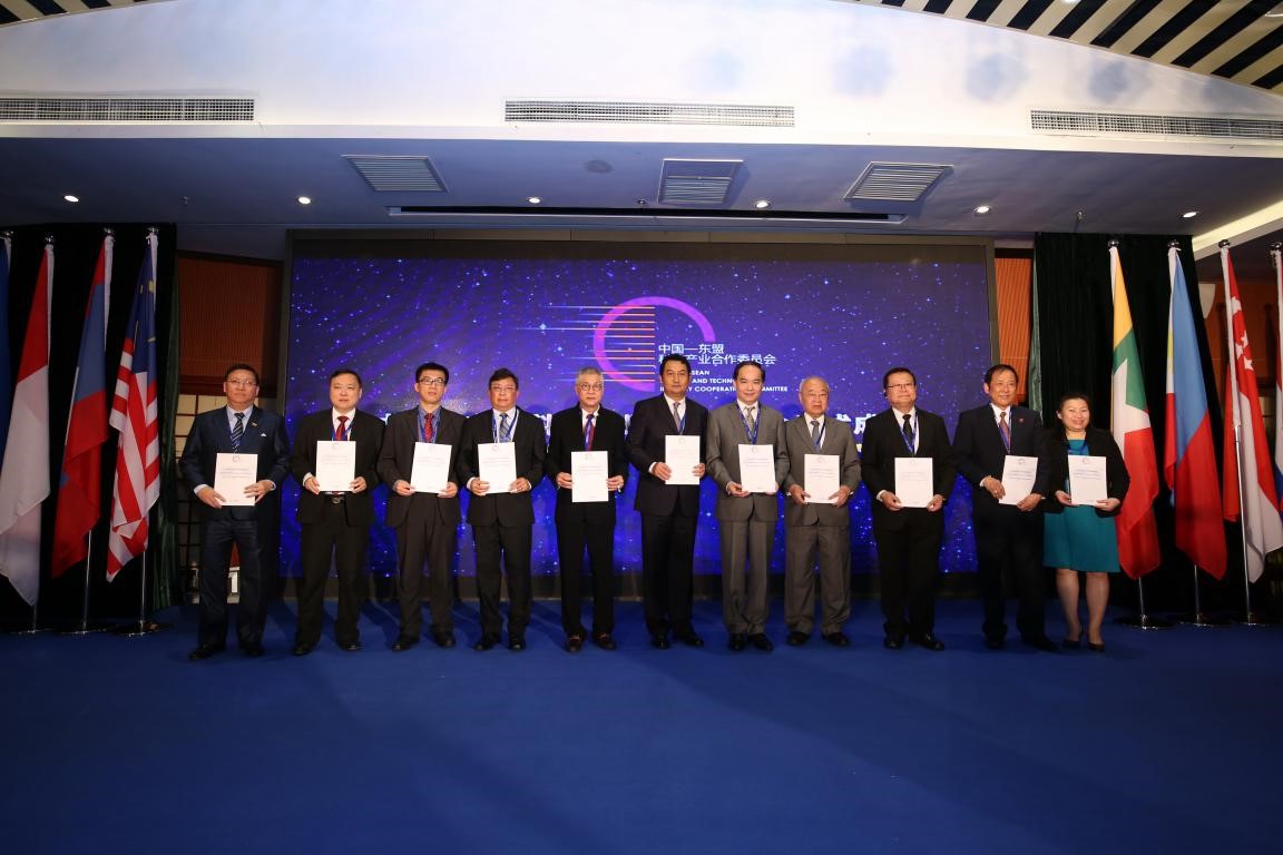 ▲ 中國與東盟十國代表簽署《關(guān)于加強中國—東盟科技產(chǎn)業(yè)合作共贏共識》