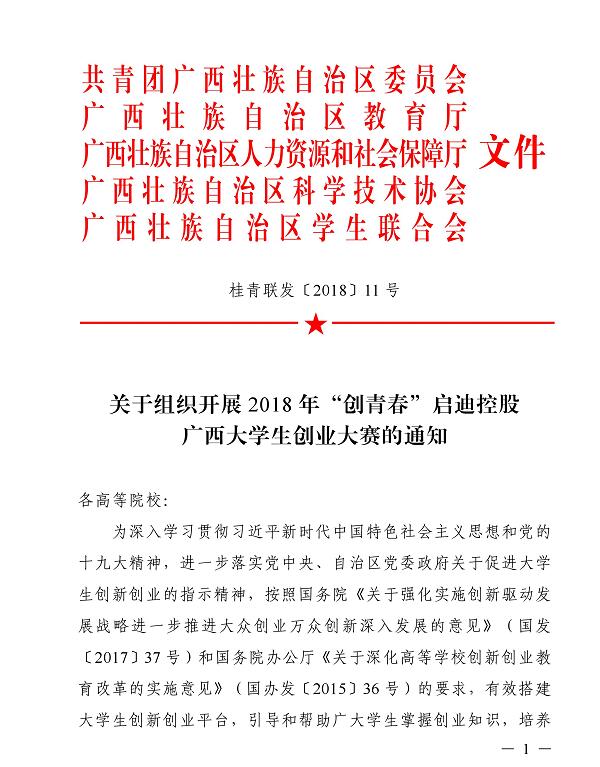 為深入學(xué)習(xí)貫徹習(xí)近平新時代中國特色社會主義思想和黨的十九大精神,進(jìn)一步落實黨中央、廣西自治區(qū)黨委政府關(guān)于促進(jìn)大學(xué)生創(chuàng)新創(chuàng)業(yè)的指示精神,近日,共青團(tuán)廣西區(qū)委員會、自治區(qū)教育廳等部門聯(lián)合印發(fā)《關(guān)于組織開展2018年“創(chuàng)青春”啟迪控股廣西大學(xué)生創(chuàng)業(yè)大賽的通知》(桂青聯(lián)發(fā)[2018]11號),搭建大學(xué)生創(chuàng)新創(chuàng)業(yè)平臺,鼓勵廣西大學(xué)生參加創(chuàng)新創(chuàng)業(yè)活動。