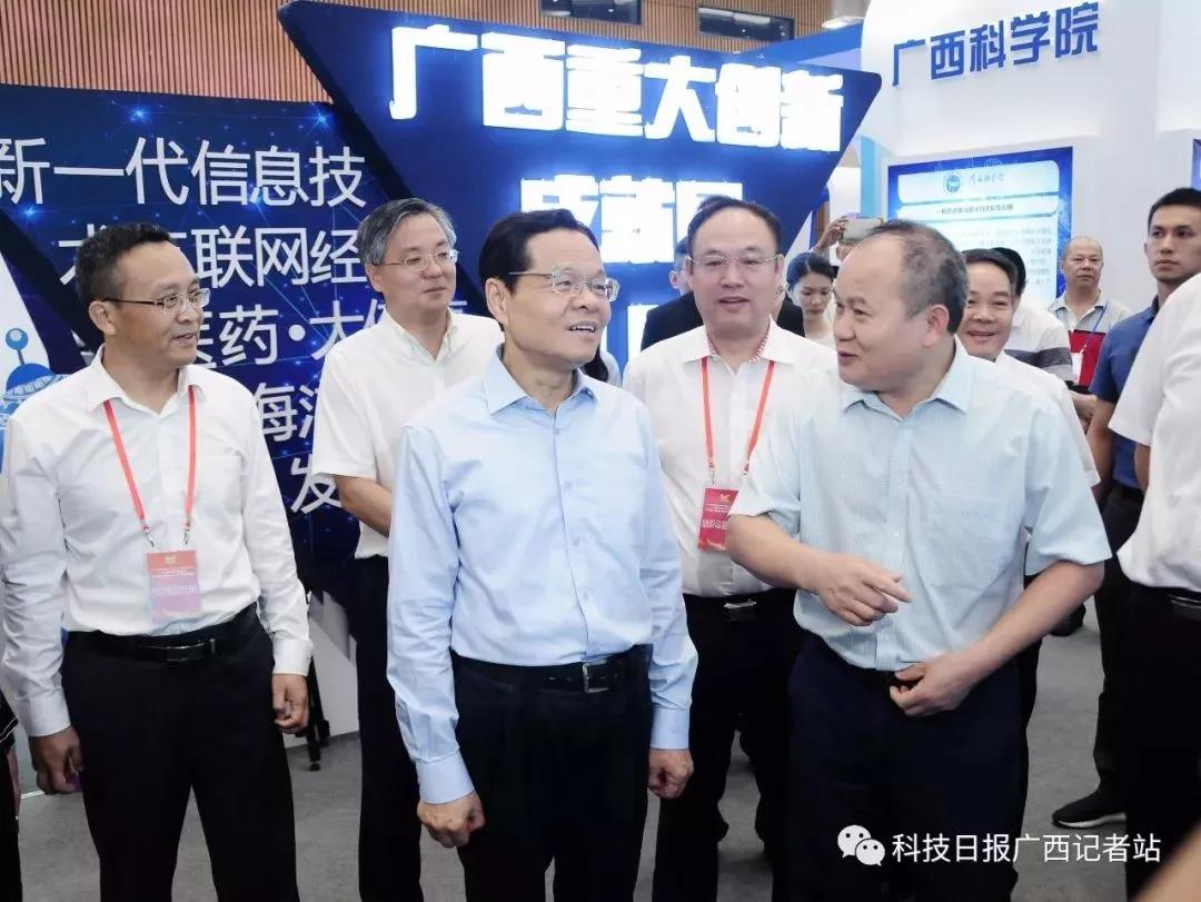 ▲ 廣西壯族自治區(qū)主席陳武(中)參觀2018年全國科技活動周廣西活動暨第二十七屆廣西科技活動周·廣西創(chuàng)新驅(qū)動發(fā)展成就展、第八屆廣西發(fā)明創(chuàng)造成果展覽交易會。廣西科技廳黨組書記、廳長曹坤華(左四)陪同參觀。