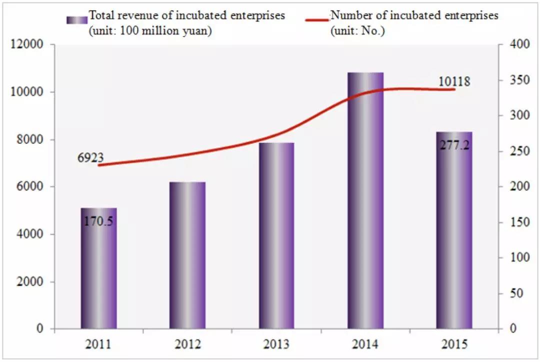 ▲ Number and total revenue of incubated start-ups in national university science parks in China (2011-2015)