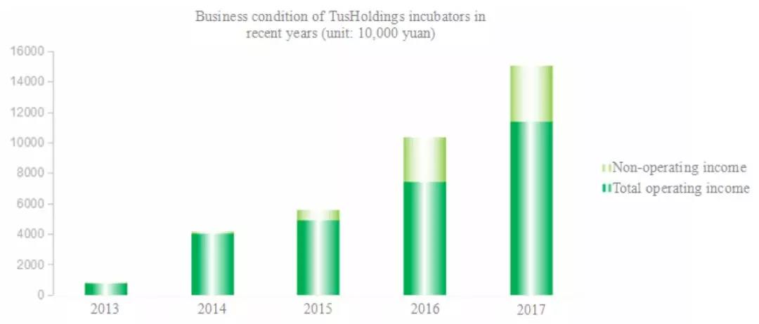 There are currently 120 TusStar incubator bases and 7 overseas bases, covering 60 cities at home and abroad. The incubators have a space area of over 300,000 square meters and over 3,000 incubated start-ups, making TusHoldings the startup incubator with widest offline coverage in China. TusHoldings has seen a continuous increase in investment return and operating income, directly manages 8 funds and has shares in 15 funds. TusHoldings has an asset base of over 2 billion yuan and has invested in over 110 projects while constantly improving its service structure. On the basis of improving spatial management, TusHoldings is committed to further improving its venture investment and innovation service. TusHoldings has made deeper exploration into the incubation model, by implementing the “Incubation service + Entrepreneurship training + Angel investment + Open platform” four-in-one incubation model and building the seven-step incubation chain of “Dream Class – Practice-Lab - Growth Plan - TusStar Camp - Diamond Plan – Go IPO - Global Network” through which TusHoldings has incubated over 5,000 start-ups, 35 enterprises of which have been listed, including Sumavision, Highlander, ChineseAll, GigaDevice and Know-How. Under the Multidimensional Triple Helix and clustering innovation development model, the resource gathering advantage of the TusStar incubation network has been further highlighted.