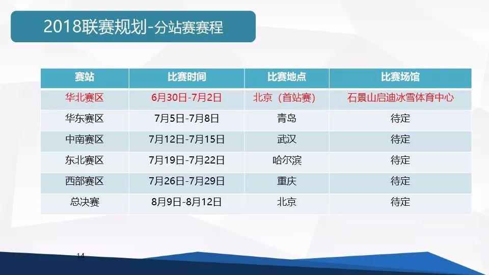 聯(lián)賽采用賽會制,由五場區(qū)域分站賽及一場總決賽組成。分站賽共覆蓋全國31個省級行政區(qū),按照中國行政區(qū)域劃分為華北、華東、中南、東北、西部五大賽區(qū)。