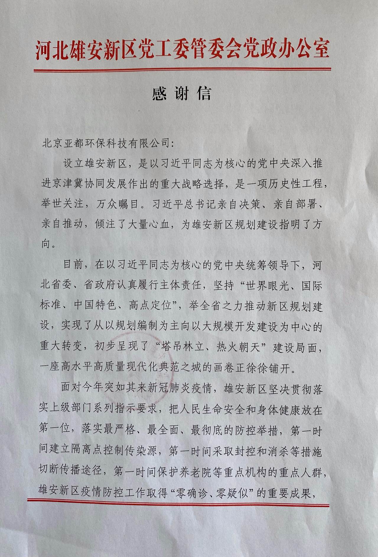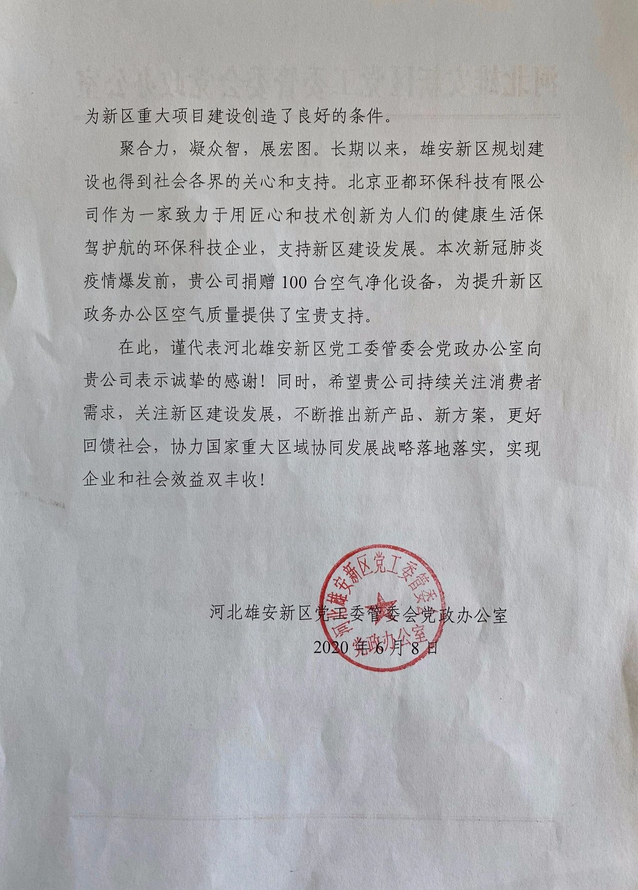 6月16日,河北雄安新區(qū)黨工委管委會(huì)黨政辦公室向啟迪亞都發(fā)來一封感謝信,由衷感謝啟迪亞都對(duì)新區(qū)建設(shè)發(fā)展的支持和對(duì)抗擊新冠肺炎疫情的傾力相助和愛心奉獻(xiàn)。信中指出:“北京亞都環(huán)??萍加邢薰咀鳛橐患抑铝τ谟媒承暮图夹g(shù)創(chuàng)新為人們的健康生活保駕護(hù)航的環(huán)??萍计髽I(yè),支持新區(qū)建設(shè)發(fā)展。”