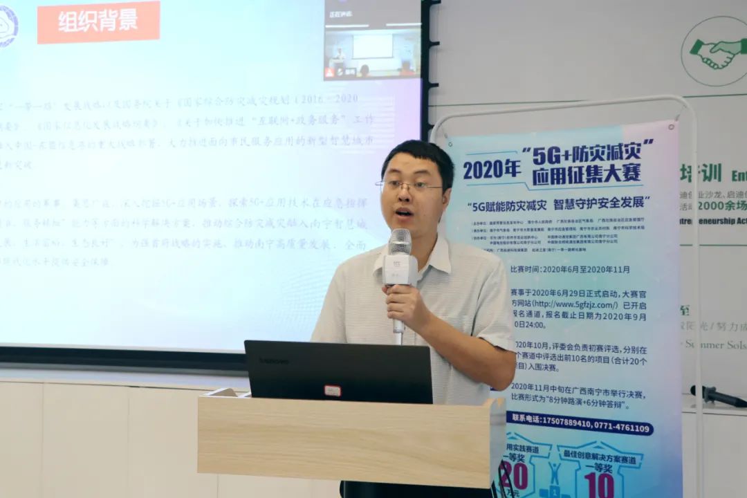 7月17日上午,2020年“5G+防災(zāi)減災(zāi)”應(yīng)用征集大賽賽事宣講廣西站在啟迪之星(南寧)一帶一路孵化基地多功能廳圓滿舉行?,F(xiàn)場共有20位參賽項目代表和創(chuàng)業(yè)團(tuán)隊成員參會,以及包括參賽團(tuán)隊在內(nèi)的100多位創(chuàng)業(yè)代表在線同步觀看活動直播。